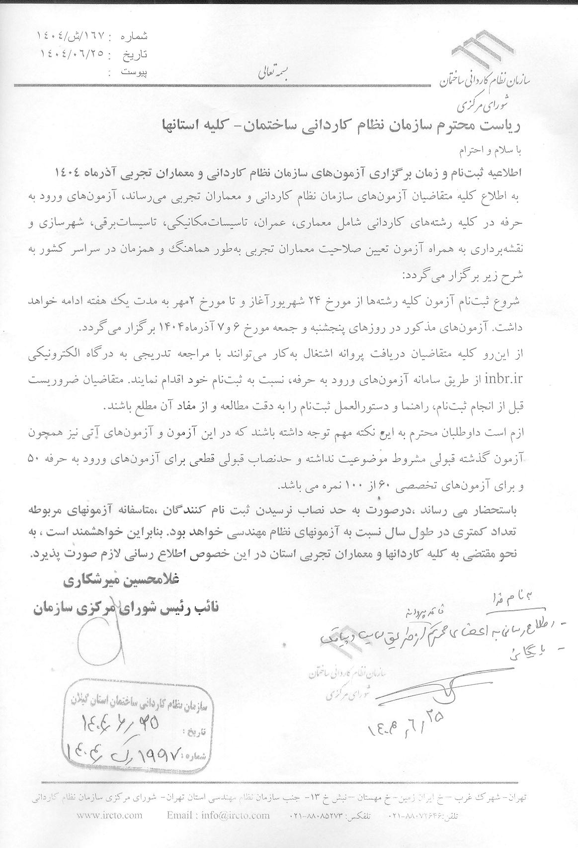 اطلاعیه ثبتنام آزمونهای ورود به حرفه نظام مهندسی و کاردانی آذرماه 1404
