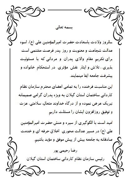 جمعه 12 دي 1404 پیام تبریک ریاست سازمان نظام کاردانی گیلان به مناسبت ولادت حضرت امیرالمؤمنین علی (ع) و روز پدر تعداد بازدید : 68